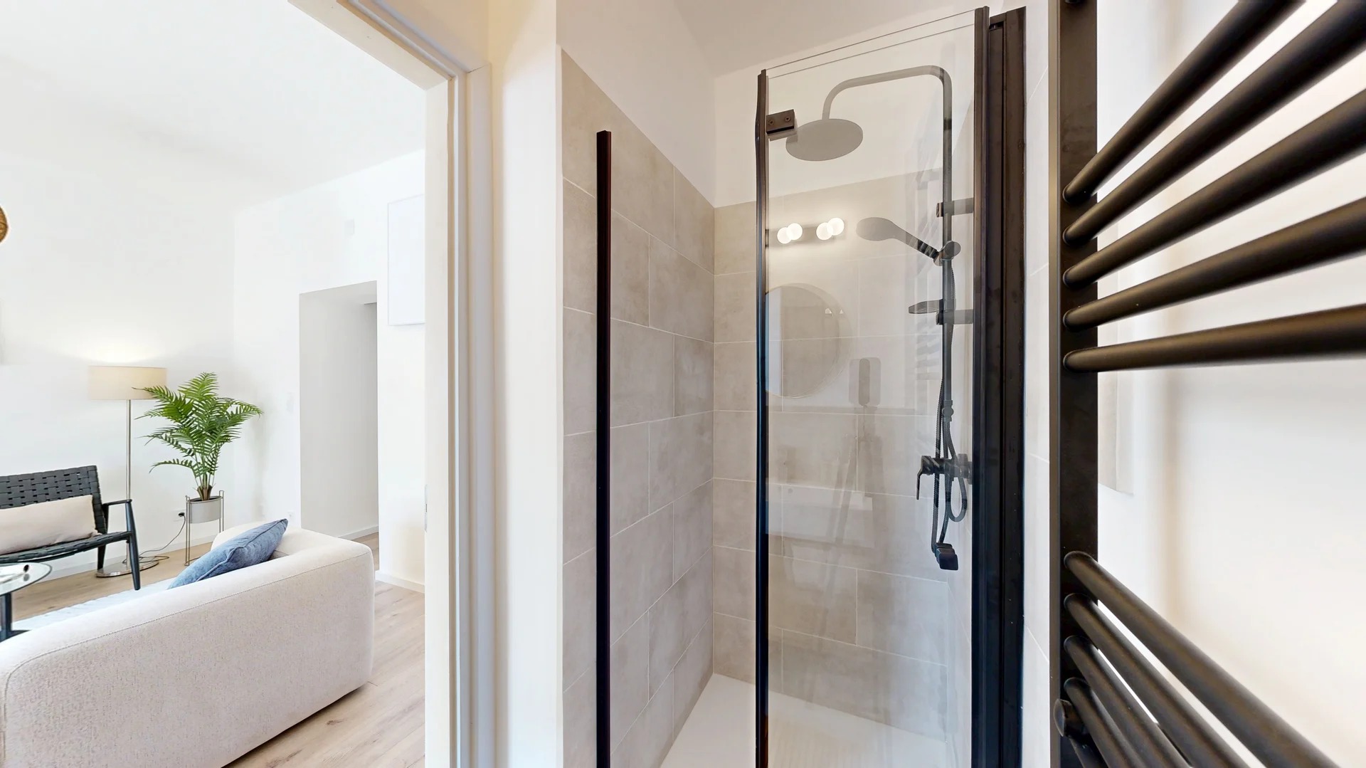 A tervezés során több problémát kellett megoldani: a szűk terek miatt minden centiméter számított, ezért rejtett tárolókat, beépített szekrényeket és többfunkciós bútorokat alkalmaztunk. A kevés természetes fényt világos falszínekkel, letisztult burkolatokkal és átgondolt, rétegezett világítással ellensúlyoztuk: mennyezeti spotok, meleg fényű fali lámpák és hangulatvilágítás segítik, hogy a lakás napközben friss, este pedig meghitt legyen. A rossz elrendezést teljesen újragondolt alaprajz váltotta fel, amelyben a közlekedés minimális helyet vesz el, a funkcionális zónák pedig logikusan kapcsolódnak egymáshoz.